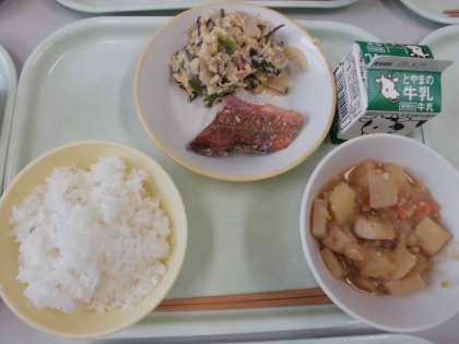 今日の給食は、ごはん・牛乳・炊き合わせ・卵ときくらげのいためもの・赤魚の塩焼きです。炊き合わせは、昆布のうまみがきいていておいしかったです。