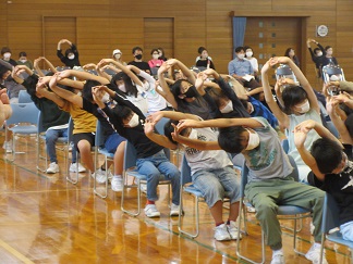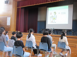 学校保健委員会を開催しました。テーマは「背中もピン!心もピン!」です。まずは、健康委員会が授業中の姿勢について発表しました。その後、講師に山室クリニックの半田豊和先生をお迎えし、「今日からやってみよう 元気に過ごすための体づくり」についてお話をしていただきました。これからも姿勢に気を付けて生活しましょう。