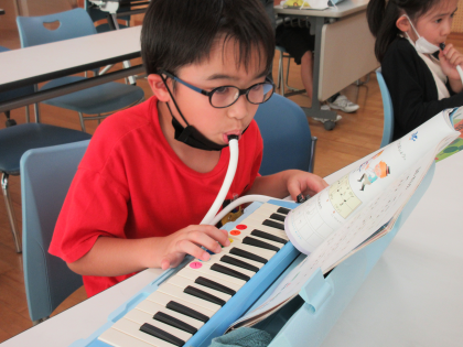 鍵盤ハーモニカの練習の様子です。指の動かし方や吹き方に気をつけながらがんばっています。