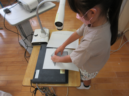 今日から三角形や四角形の学習が始まりました。三角や四角の形を使っていろいろな形を作った後、それぞれの形をどのように仲間分けができるか考えました。「三本の直線にかこまれている形が三角形」「四本の直線にかこまれている形が四角形」ということを学習しました。