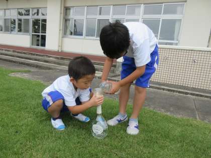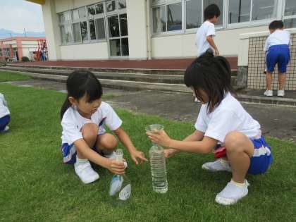 算数「どちらがおおい」の学習で、水の量比べを実際に子供たちがやってみました。直接水を比べる入れ物に移し替えたり、同じ大きさのマスに移して比べたりすることをペアや生活班でやりました。子供たちは、先週学んだ比べ方を本当にやってみて、水の量の比べ方を習得していました。