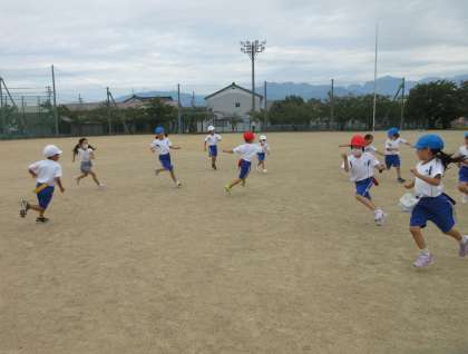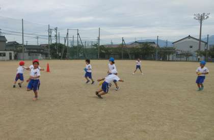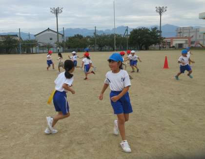 今日の体育は、しっぽ取りゲームを行いました。タグといわれる40センチメートルほどの布を腰に付けて、それを鬼になった人が取るというゲームです。鬼は、色団で交代で行いました。みんな、鬼になったときは取ろうと、また逃げるときは取られまいと必死になって走りました。