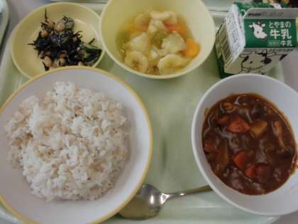 今日の給食は、麦ごはん・牛乳・食べキリンハヤシ・大豆とひじきのサラダ・フルーツゼリーミックスです。食べキリンハヤシとは、玉ねぎ・ベーコン・きのこ・りんごがハヤシライスに入ったものです。頭文字をとると、「たべキリン」になります。コクがあっておいしかったです。