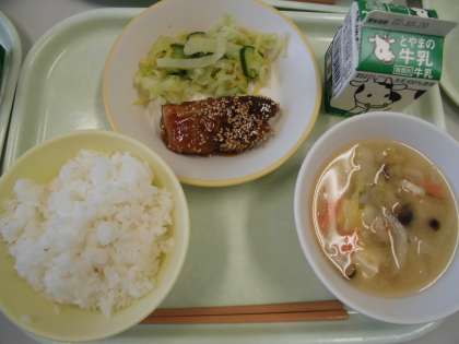 今日の給食は、ごはん・牛乳・五目みそ汁・あわせ和え・ふくらぎのごまだれかけです。