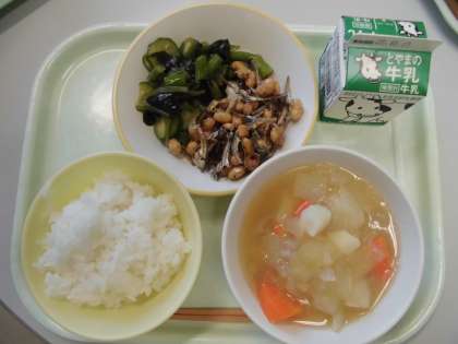 今日の献立は、ご飯・牛乳・小魚入りフライビーンズ・海藻サラダ・ポトフです。