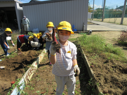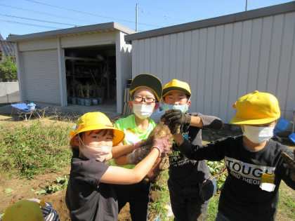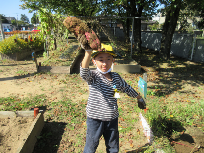 畑を掘っていると、たくさんのさつまいもを見付けました。いろいろな形のさつまいもを見付けては、「さつまいもがつながっている!兄弟のさつまいもだ!」「とっても大きい!」「小さくてかわいい」など、話していました。