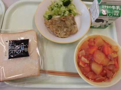 今日の給食は、食パン・牛乳・チョコレートクリーム・豆とベーコンのトマト煮・そえ野菜・魚のえごま揚げです。トマト煮は、トマトの酸味とベーコンのうまみがきいていて、おいしかったです。