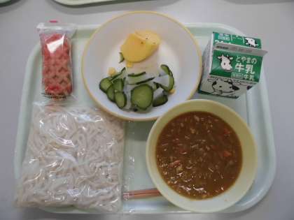 今日の献立は、ソフト麺・牛乳・カレーソース・チーズドッグ・大根サラダ・柿です。