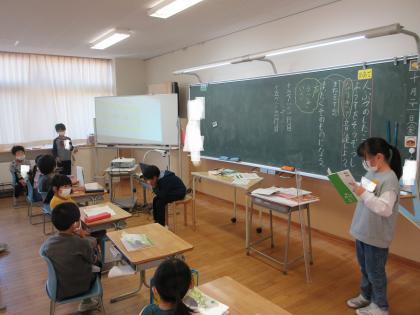今日は「お手紙」のお話をグループごとに音読しました。「登場人物のしたことや様子を想像しながら、なりきって音読しよう」という目当てで活動しました。子供たちは「がまくん」の落ち込んだ様子や「かえるくん」の動きなど上手に表現していました。
