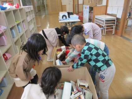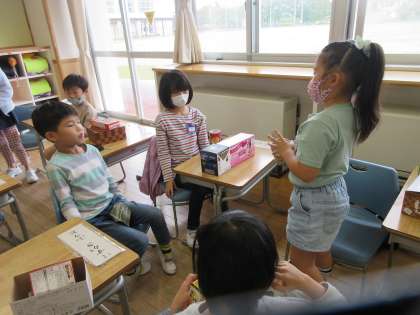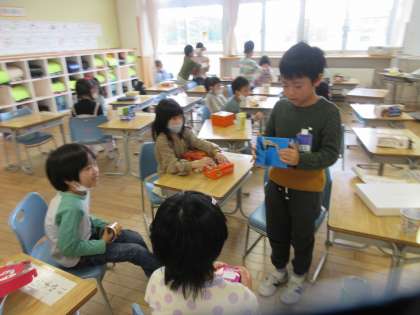 算数では、いろいろな箱から、長四角や真四角、丸といった形を見つけて、箱の形を説明するという学習をしました。全員に伝えた後は、各グループで友達に説明する場を設け、一人一人がグループの友達に箱を見せながら形を伝えることができました。
