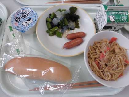 今日の給食は、コッペパン・牛乳・いかやきそば・こんにゃくサラダ・あらびきウインナー・ヨーグルトです。こんにゃくサラダは、わかめ・アスパラ・サラダこんにゃくを青じそドレッシングで和えました。さっぱりしておいしかったです。