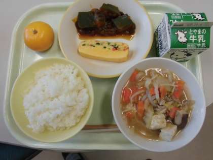 今日の献立は、ご飯・牛乳・千草焼き・かぼちゃのいとこ煮・はくさいなべ・みかんです。