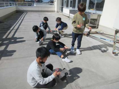 虫めがねを使って日光を集める実験をしました。「大きな虫めがねの方がすぐに煙が出るね。」「光が小さく集まると煙が出始めるね。」子供たちはいろいろなことに気付きました。