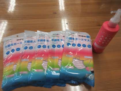 水橋獅子の会様より、児童と職員に「不織布ガードマスク(7枚入り)」と手指消毒剤を寄贈していただきました。本日、お子さんがマスク5袋と手指消毒剤1本を持ち帰りますので、ぜひご活用ください。