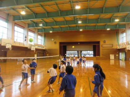 「ネット型ゲーム」学習で「風船バレー」をしました。普通の風船ではふわふわし過ぎるのでテープを巻いて重くしています。子供たちはとても楽しそうに対戦しています。
