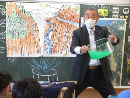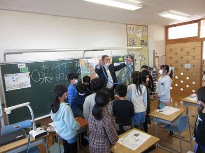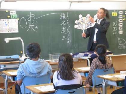 今日は、伏黒昇先生をお招きし、滑川市出身の「椎名道三」のお話をしていただきました。大ききんから貧しい人々を救うために、越中・加賀・能登で多くの用水作りと開拓を行った道三について、たくさんのことを初めて知り、いろいろなことに驚いていました。これからの社会科の学習につながるので、興味をもって取り組めそうです。