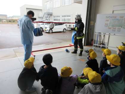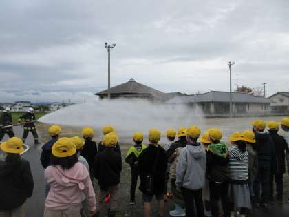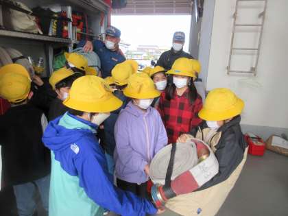 学習したことを基に、店長さんや消防士さんに質問したり、消防署では消防車や放水訓練等を見学したりしました。