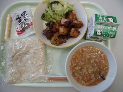 今日の献立は、ソフト麺・牛乳・肉みそソース・大学いも・花野菜サラダ・味付け小魚・棒チーズです