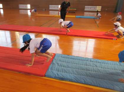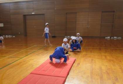 体育で「マット遊び」をしました。今日はマットの出し入れや、マット運動用の準備体操を学びました。「いもころがし」「クマ歩き」「うさぎ跳び」「でんぐりがえし」を紹介し、一生懸命取り組みました。