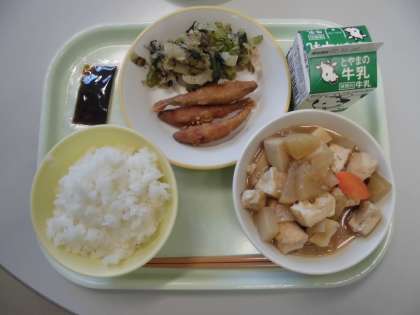 今日の献立は、ご飯・牛乳・わかさぎのフリッター・梅肉和え・里芋と厚揚げのうま煮・のり佃煮です。