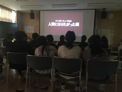 視聴覚室で劇団四季のこころの劇場「人間になりたがった猫」を鑑賞しました。劇団の方の演技のすごさやストーリーのおもしろさを楽しみました。