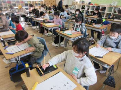 書き初めに向かって練習をしています。今日は初めて自分の名前を書きました。