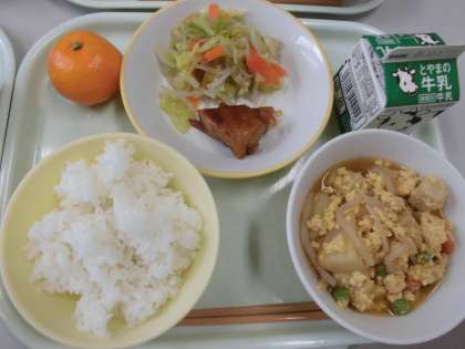 今日の給食は、ごはん・牛乳・野菜ソテー・照り焼きチキン・卵とじ・みかんです。みかんにはビタミンCがたくさん入っています。ビタミンCには免疫力を高めてくれる働きがあるため、風邪を予防してくれます。寒くなる今の季節にぴったりですね。