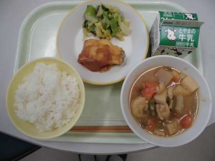 今日の献立は、ご飯・牛乳・魚の黒酢あん・はくさいひたし・関東だきです。