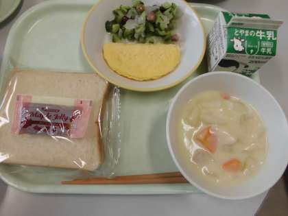 今日の給食は、食パン・牛乳・クリーム煮・ミックスビーンズ・オムレツ・メープルジャムです。ミックビーンズは、きゅうりやたまねぎも切り方がそろえられていて食べやすかったです。手作りドレッシングともよくあいました。