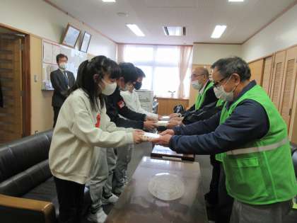 今日は、富山中央交通安全協会水橋中部支部の皆さんが来校されました。年末に向けて交通安全を意識するために、身近な方々に年賀はがきを送ってほしいということで6年生の代表に手渡されました。来週、全校に配ります。