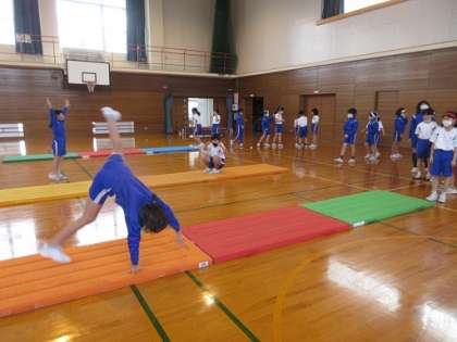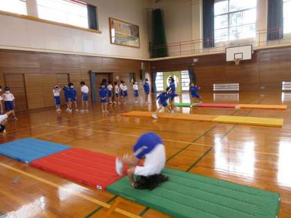 マット運動の発表会を行いました。前転や後転をきれいに決めたり、難易度の高い技に挑戦したりと、それぞれががんばりました。