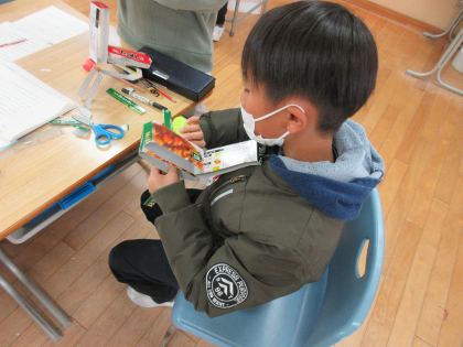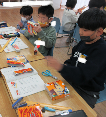 国語科では、教科書の「馬のおもちゃの作り方」を読みながら、実際におもちゃをつくってみました。つくりながら、文章の中でどの説明がわかりやすかったかについても考えました。