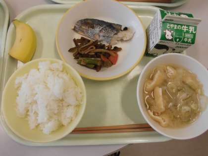 今日の給食は、ごはん・牛乳・具だくさんみそ汁・鰆の塩焼き・茎わかめのきんぴら・バナナです。茎わかめのきんぴらは、人参・いんげんが入り鮮やかないろどりです。茎わかめとれんこんの歯ごたえもありおいしかったです。