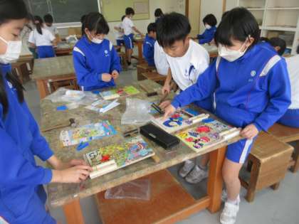 「コロコロゲーム」をつくっています。釘や輪ゴム等を使って、それぞれに楽しい仕組みを工夫しています。