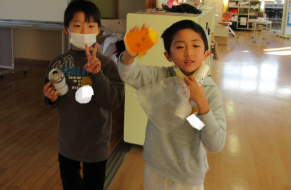 生活科では、おもちゃ作りをしました。作っている途中、「うまくいかないな」と悩んでいる姿もありましたが、いろいろな方法を試したり、友達にアドバイスを聞いたりして、完成を目指していました。