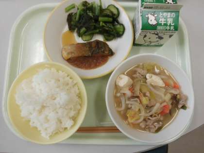 今日の献立は、ご飯・牛乳・ふくらぎのみぞれかけ・とろろ昆布和え・白菜なべです。
