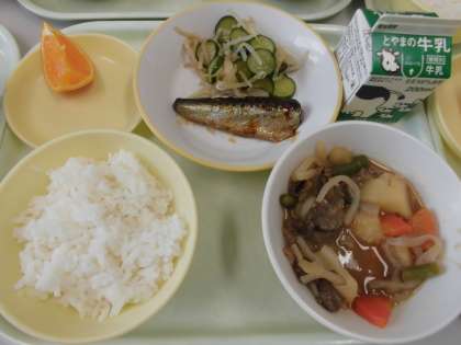 今日の給食は、ごはん・牛乳・肉じゃが・甘酢和え・いわしの梅煮・あいかです。あいかは、愛媛県で生まれた新しい品種のみかんです。ぷるぷるとした果肉と濃い甘さが特徴です。皮が薄く甘くて何個でも食べられそうなおいしさでした。子供たちにも人気でした。