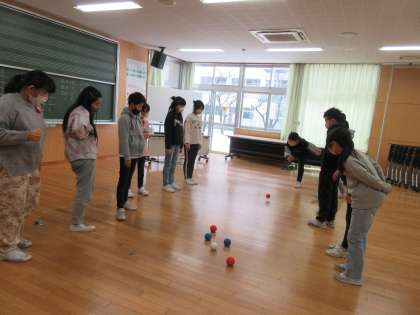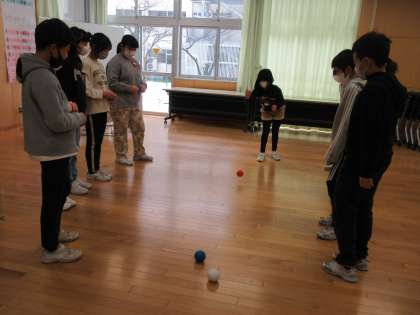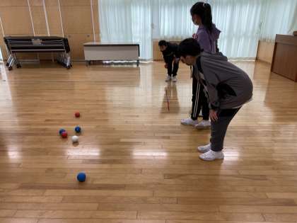 今日はパラリンピックの競技でもある「ボッチャ」を体験しました。一投ごとに一喜一憂しながら楽しく取り組みました。