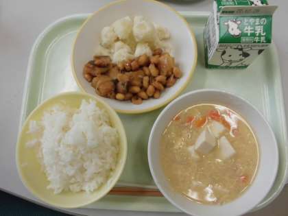 今日の献立は、ご飯・牛乳・かきたま汁・こふきいも・魚と大豆のねぎソースかけです。