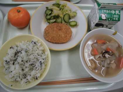 今日の給食は、わかめごはん・牛乳・冬至の根菜汁・かぼちゃコロッケ・ゆず和え・みかんです。今日は、冬至献立です。冬を感じる献立でおいしかったです。そして今日は給食最終日でした。朝はやくから一生懸命、給食を作ってくださる調理員のみなさん2学期もお疲れ様でした。いつもありがとうごさいます。3学期もよろしくお願いします。