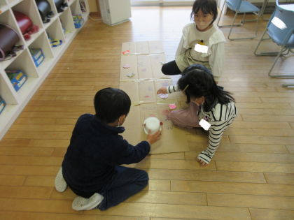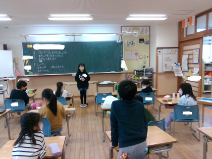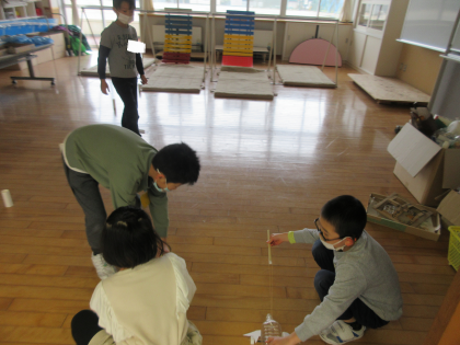生活科では、つくったおもちゃをみんなで遊びました。みんなの前で使い方や自分ががんばったところを紹介して、グループに分かれてみんなでおもちゃを体験しました。「楽しい!」「もう一回やらせて!」など、楽しそうな声が聞こえました。
