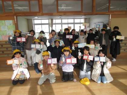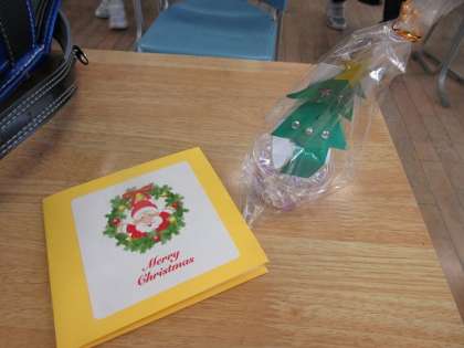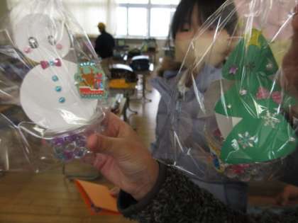 終業式の後、クリスマスツリーや雪だるまを画用紙でつくり、土台にはビーズを入れ、素敵なクリスマス飾りをつくりました。「玄関に飾ろう」「お母さんにプレゼントしよう」と、みんなうれしそうでした。