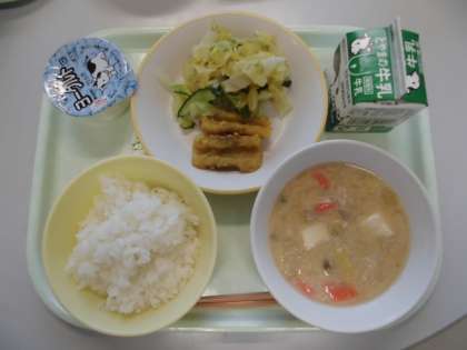 今日の献立は、ご飯・牛乳・ちくわのカレー揚げ・あわせ和え・豆乳汁・ヨーグルトです。