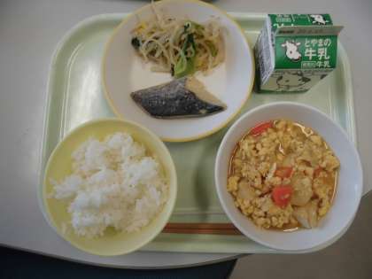 今日の献立は、ご飯・牛乳・鰆の西京焼き・コーン和え・厚揚げの卵とじです。