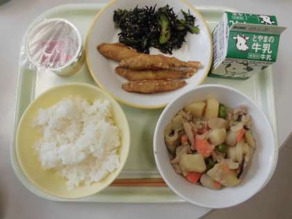 今日の献立は、ご飯・牛乳・わかさぎのフリッター・ひじきのごま和え・豚肉の南蛮煮・納豆です