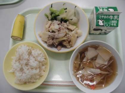 今日の献立は、麦ご飯・牛乳・塩だれ豚丼・かぶの色どり・ワンタンスープ・バナナです。
