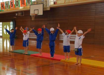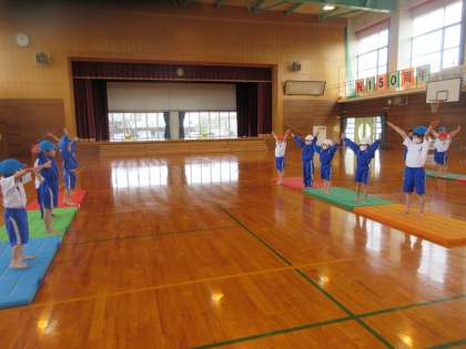 今日の体育は、マットで運動をしました。最後のポーズをかっこよく決められるように、ポーズの特訓もしました。