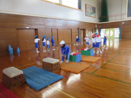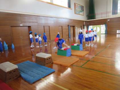 今日は、技7の続きで紙でっぽう、ミニ跳び箱、ラダーに挑戦しました。何度も練習しているうちに慣れてきてできるようになり、みんな夢中になって運動しました。