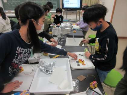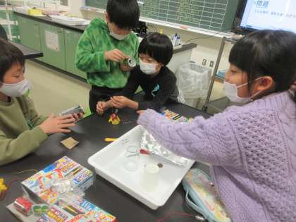 理科「明かりをつけよう」で「電気を通す物」を調べました。はさみや1円玉等を豆電球の回路に入れて実験しました。