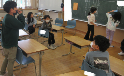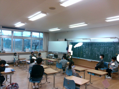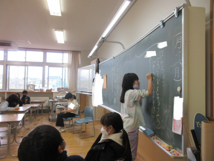 卒業を祝う会に向けて、スローガン等について話し合っている様子です。2年生が司会や書記となり、クラスで意見を出し合いながら話し合いを進めました。